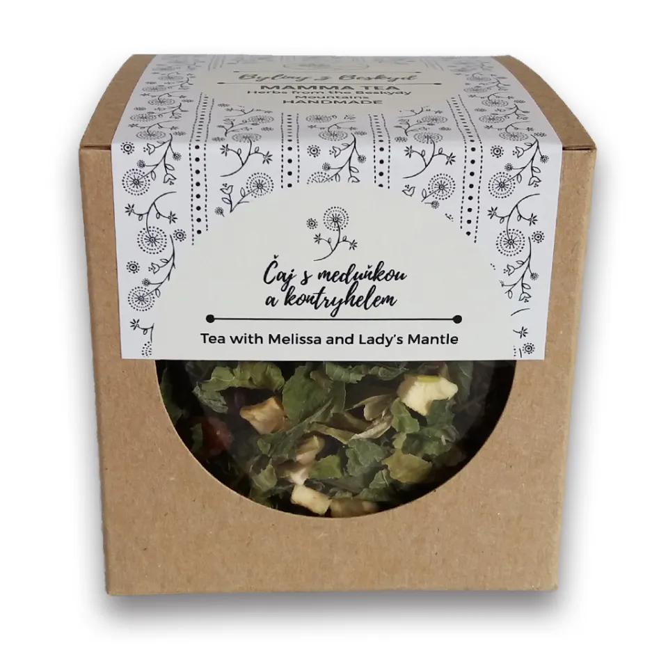 V čaji s bílou krabičkou najdete bylinu vlhkých horských luk, bylinu nejen pro ženy – kontryhel. Pro vyváženou chuť jsme ji doplnili meduňkou. Ovocnou složku tvoří jablka, černý rybíz a rozinky.