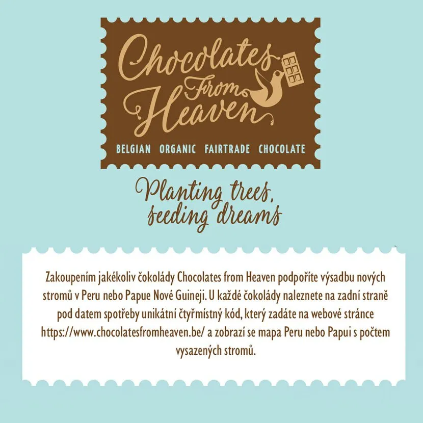 Nápad vytvořit tuto designovou řadu Fairtrade a BIO certifikovaných čokolád přišel v roce 2017. O úspěšnosti této řady svědčí i fakt, že čokolády Chocolates from Heaven vyhrály v roce 2017 bronzovou medaili v prestižní mezinárodní soutěži obalového designu Pent Awards! Hlavním motivem byla snaha nabídnout zákazníkům řadu čokolád plných zdravých BIO ingrediencí v krásných moderních obalech a s prokazatelným spravedlivým původem surovin. Veškeré ingredience jsou 100% přírodní. Hořké čokolády Chocolates from Heaven obsahují 72 - 85 % kakaa, mléčné čokolády 36 % kakaa a bílá čokoláda 32 % kakaového másla. Kakao pochází od Fairtrade farmářů z Dominikánské republiky a Peru, použitý je pouze přírodní nerafinovaný třtinový cukr.