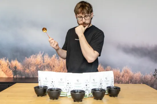 Na cuppingu se káva srká. Možná to zní nezvykle, ale má to svůj důvod. Když kávu rychle nasajete do úst, rozprskne se po celém patře a vy tak lépe můžete vnímat její chutě i aroma.
