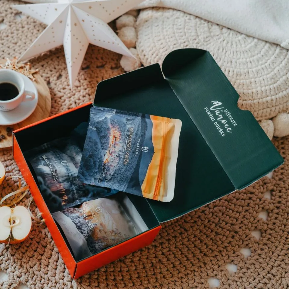 Balíček obdržíte dárkově zabalen v krabičce na fotografii, můžete ji tak rovnou věnovat jako dárek.