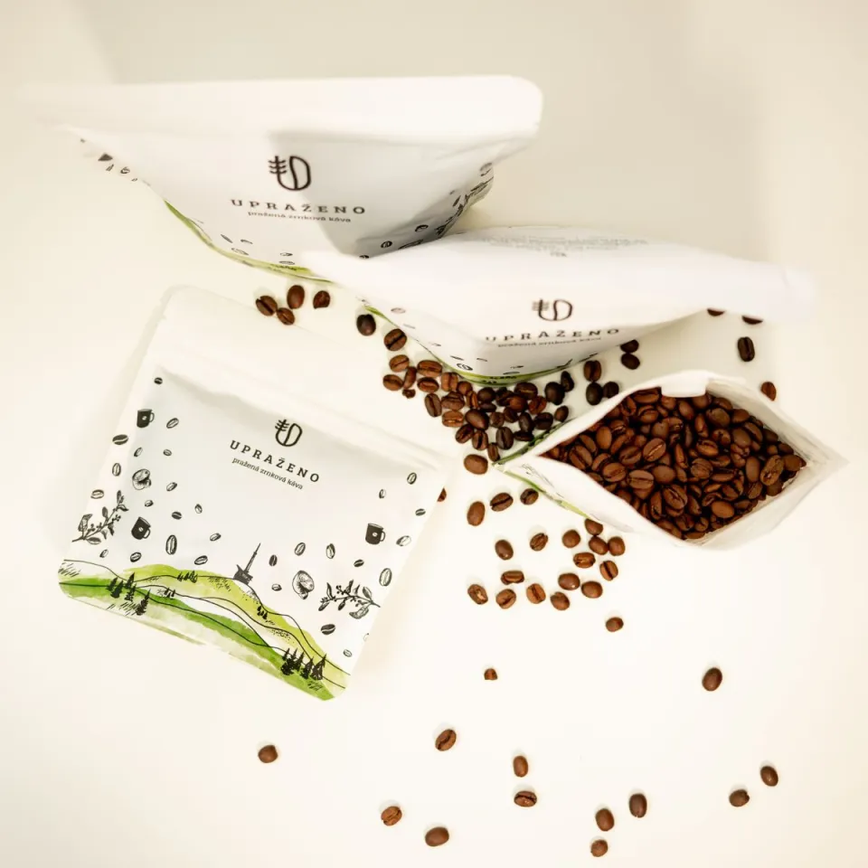 stojící sáček zrnkové kávy s logem UPRAŽENO a ilustrací zelených kopců a kávy zrn