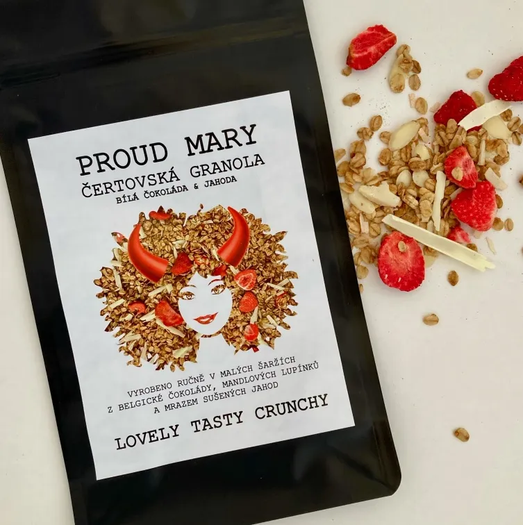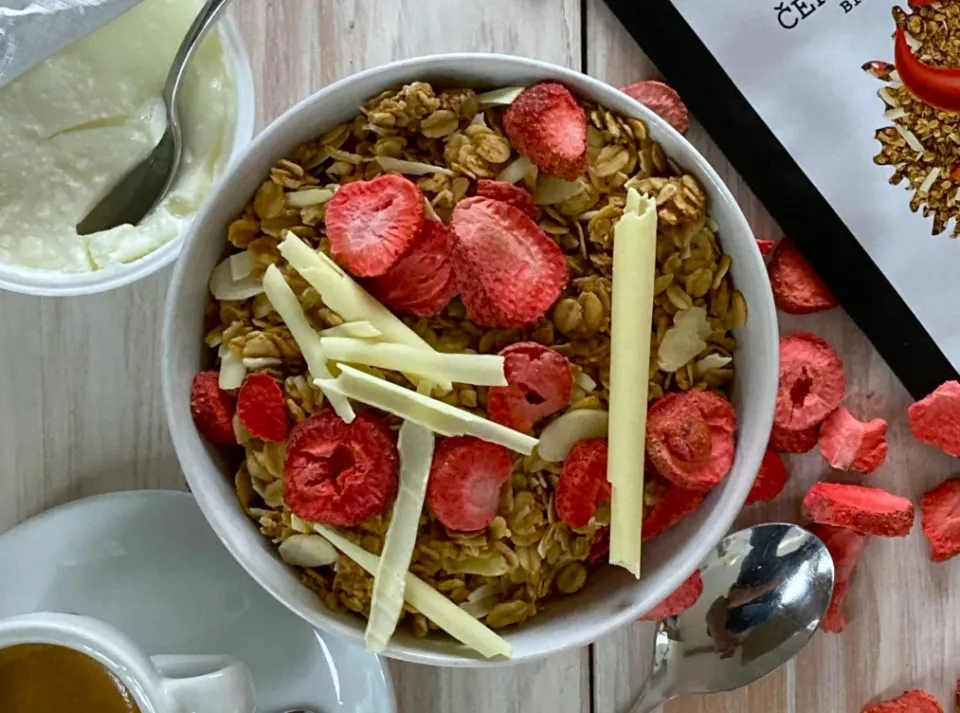Kombinace lyofilizovaných jahod, belgické bílé čokolády a mandlových lupínků. V kombinaci s mlékem vytvoří jahody a čokoláda výborný milkshake. Milují ji děti i dospělí.