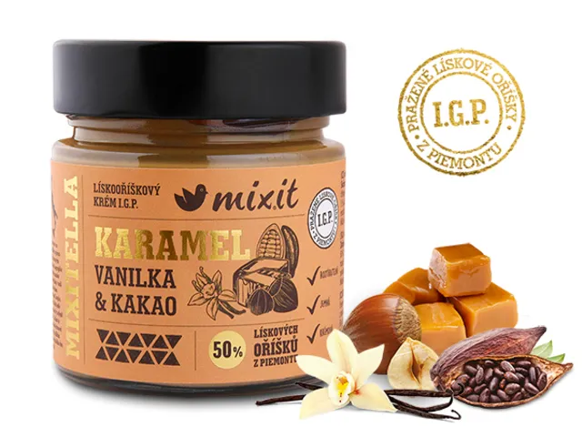 Mixitella s oříšky z Piemontu a s karamelem je vždy neobyčejně jemná, krásně roztíratelná a plná lískových oříšků, které se pyšní ochranným označením I.G.P. (Indication of Geographic Protection). Tato varianta je doplněna o kvalitní kakaový prášek, plnotučné mléko, kakaové máslo, třtinový cukr a přírodní extrakt vanilky. Každý lískový oříšek v Mixitelle byl s láskou sklizen v malebném kopcovitém kraji Langhe, v srdci regionu Piemont. Odtud podle odborníků a gurmánů pocházejí ty nejlepší lískové oříšky na světě. A důkaz je ukrytý pod víčkem! Hedvábně krémová Mixitella je díky lískovým oříškům z Piemontu skutečnou oslavou každého dne. Buon appetito!